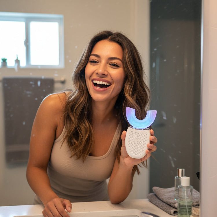 El blanqueamiento UV integrado y la corrección del color abordan las manchas superficiales. La mayoría de los usuarios notan dientes más brillantes en una semana.