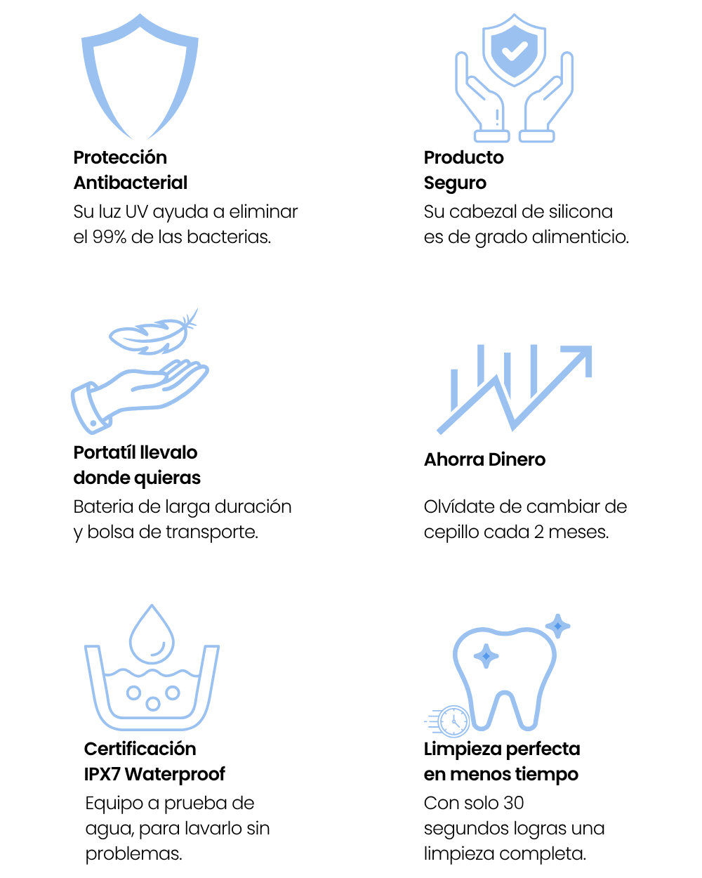 Experimente una limpieza bucal completa en solo 30 segundos con nuestra boquilla de silicona en forma de U. 48,000 vibraciones de alta frecuencia por minuto aflojan la placa sin esfuerzo mientras que el blanqueamiento UV y la corrección de color eliminan las manchas. Elija entre el modo suave, potente o spa para un cuidado personalizado, todo envuelto en silicona antibacteriana que masajea suavemente las encías sin irritación.